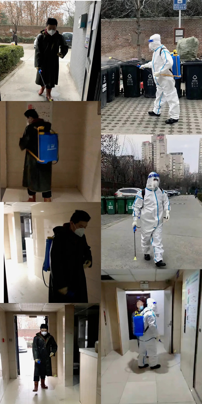 冬日的清晨分外寒冷,每一日天还不亮,后勤保障人员已经开始办公楼、公寓楼、食堂和公共区域的消杀工作,为了确保每一个角落都不放过,消杀人员穿着厚重的防护服背着消毒水一层层的进行消杀,即便是寒冷的冬天,他们的额头都布满汗水。为了员工及其家属的安全,也为了城市尽快摆脱疫情的阴霾,他们认真负责,从没有一句抱怨。