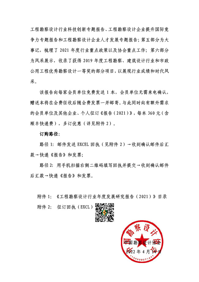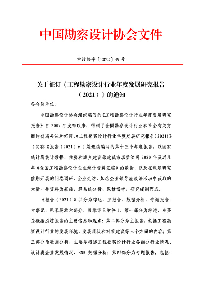 关于征订《工程勘察设计行业年度发展研究报告(2021)》的通知 中设协字〔2022〕39号