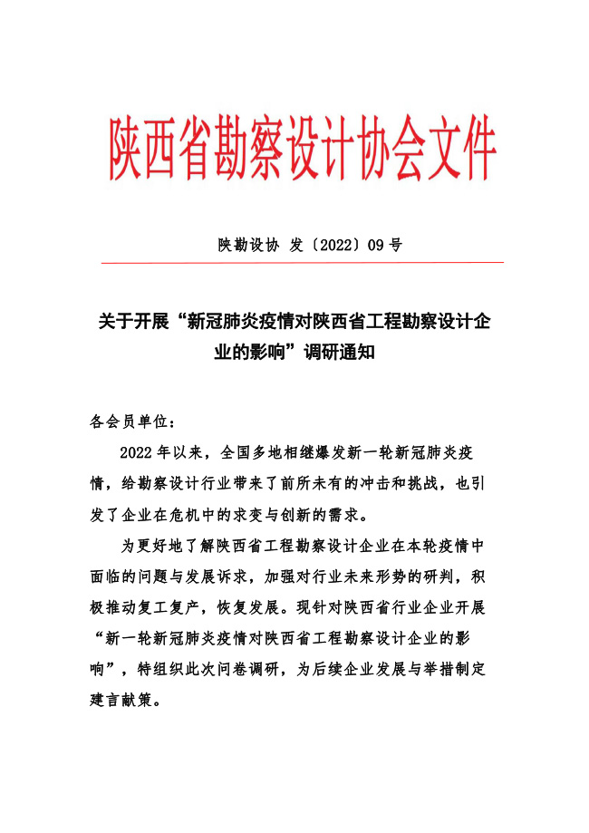 关于开展“新冠肺炎疫情对陕西省工程勘察设计企业的影响”调研通知 2022年9号