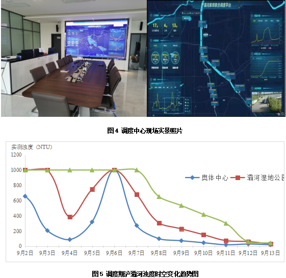 截止9月13日,全运湖上下游区域浊度已由1000以上已全部降至20以下,达到地表水Ⅱ类标准,浐灞河流域整体水量充足、水质良好,完成“一河清水”的调度目标,调度成效显著。