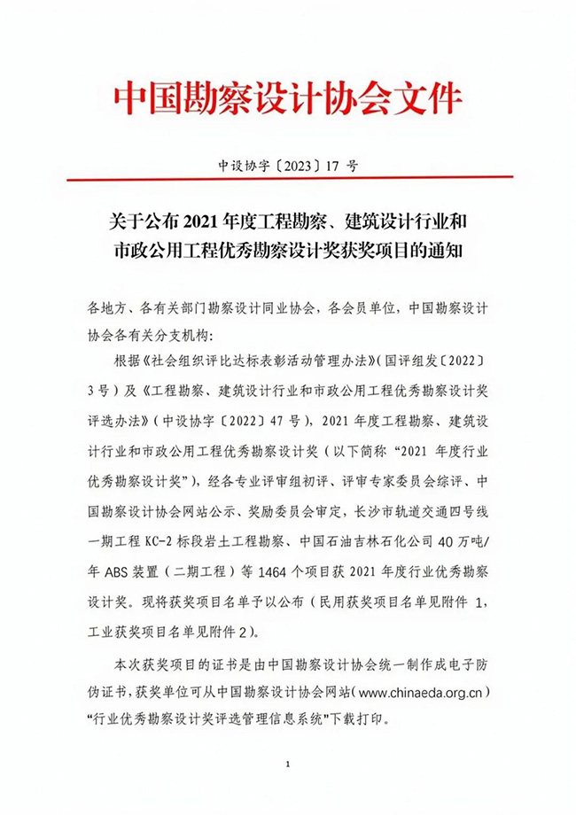 2023年2月28日,中国勘察设计协会发布中设协字〔2023〕17号文件:《关于公布2021年度工程勘察、建筑设计行业和市政公用工程优秀勘察设计奖获奖项目的通知》,我省推荐的36个项目获奖,其中一等奖7项,二等奖14项,三等奖15项。