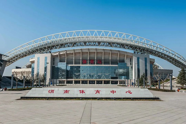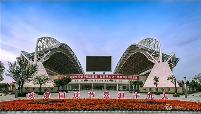 渭南市体育局体育场位于陕西省渭南市,为该市标志性建筑之一。体育场钢罩棚是以主、副拱和拱间桁架为主要受力构件的空间管桁架结构,主拱跨度290m,属超大跨度空间钢结构。我院通过一系列创新技术措施有效解决了本项目超大跨度空间钢结构设计的各类难题和挑战:对整体结构进行弹塑性稳定分析和性能设计;对多杆件小角度交汇节点等关键节点进行有限元分析并采取局部加强措施;对几何关系复杂、受力集中的拱脚采用可扭转的铰支座,并对铰支座进行有限元分析;通过拱脚墩台周边地基处理及抗推桩解决巨大的推力问题;进行全过程健康监测,验证设计的可靠性和安全性。