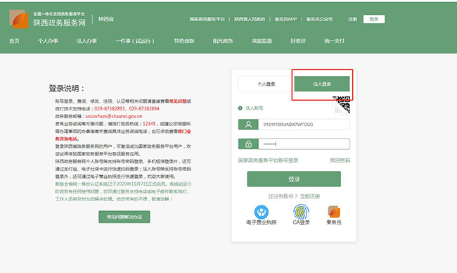 第四步:点击“法人登陆”(注意:账号是已在陕西省政务服务网进行注册的企业账号)