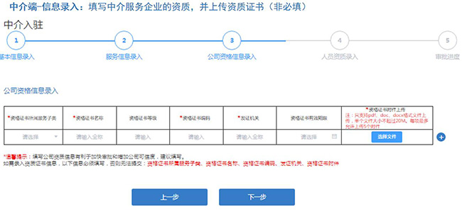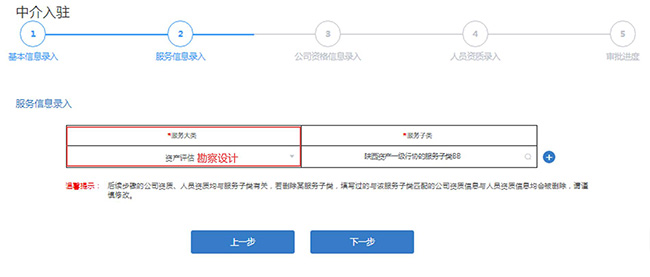 第八步:填写服务信息(注意:陕西省勘察设计协会服务项目为:勘察设计,其他行业服务项目可点右侧加号添加,添加后由所属行业的审核机构进行审核)