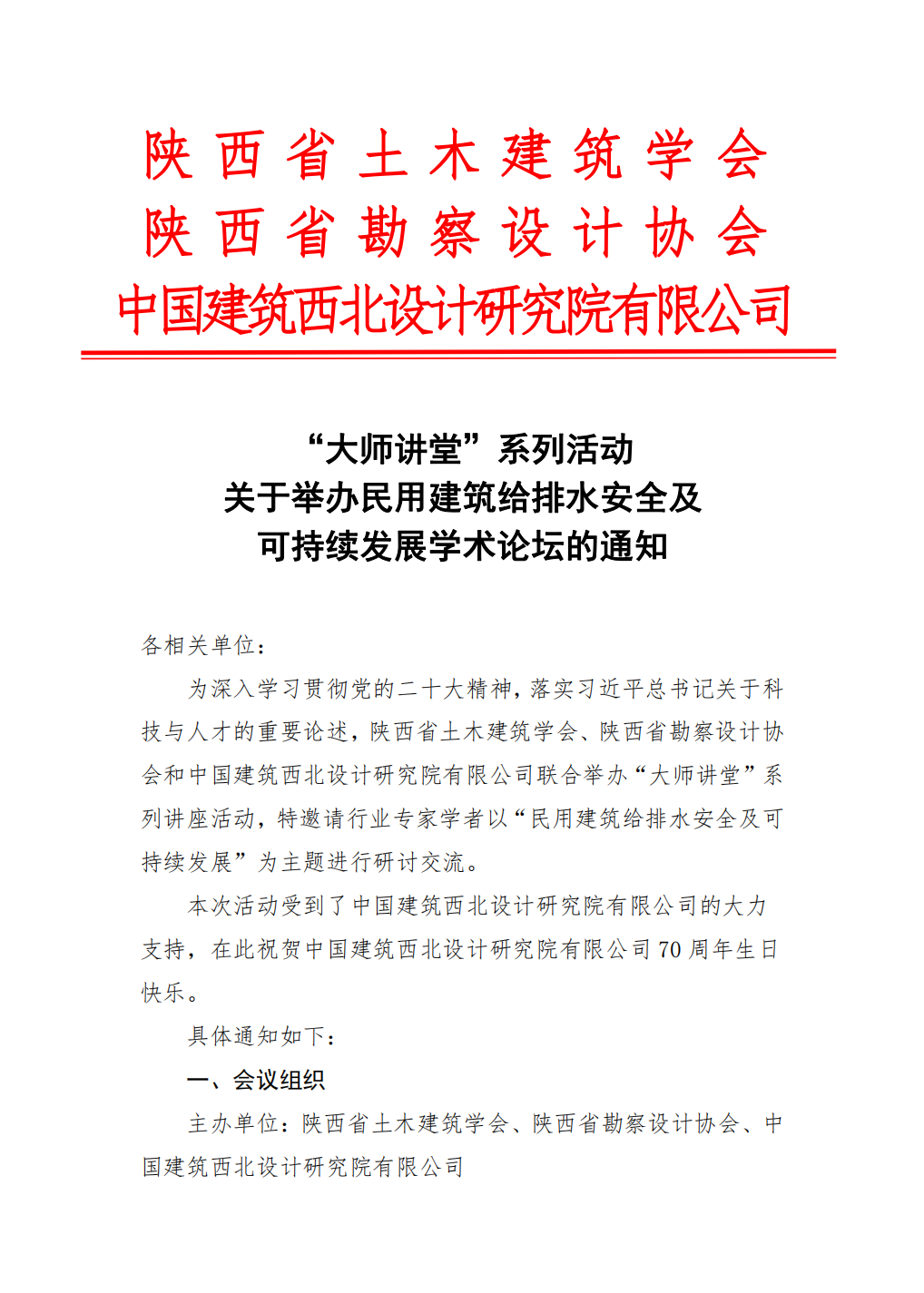 “大师讲堂”系列活动关于举办民用建筑给排水安全及可持续发展学术论坛的通知