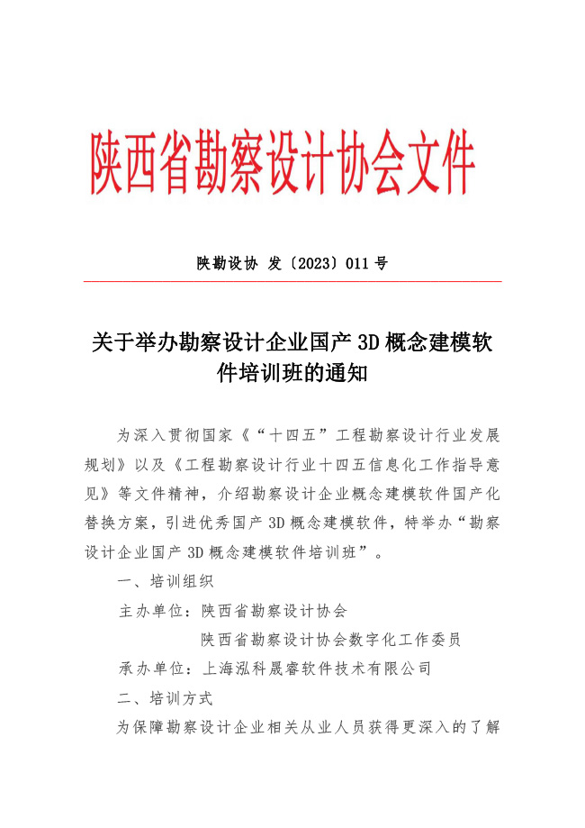 陕勘设协〔2023〕011号 关于举办勘察设计企业国产3D概念建模软件培训班的通知