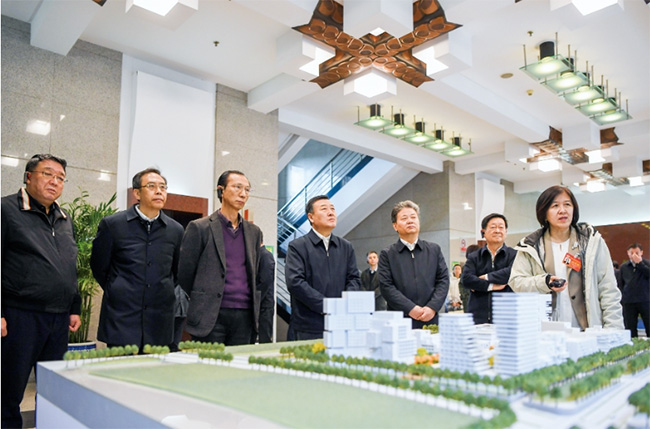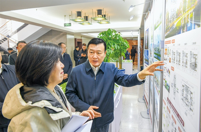 在获奖作品《相适·相望》介绍展板前,倪虹走上前仔细察看户型图,了解设计特色。这个获奖作品以“塑造可变生活空间”为亮点,针对不同群体开发了“二人世界”“家带萌娃”“三代同堂”“活力长者”四个产品类型,内部没有剪力墙承重柱的约束,创造了灵活可变的布局设计。倪虹认真听取专家介绍,不时询问动线设计、技术工艺、部品部件等设计建造情况。