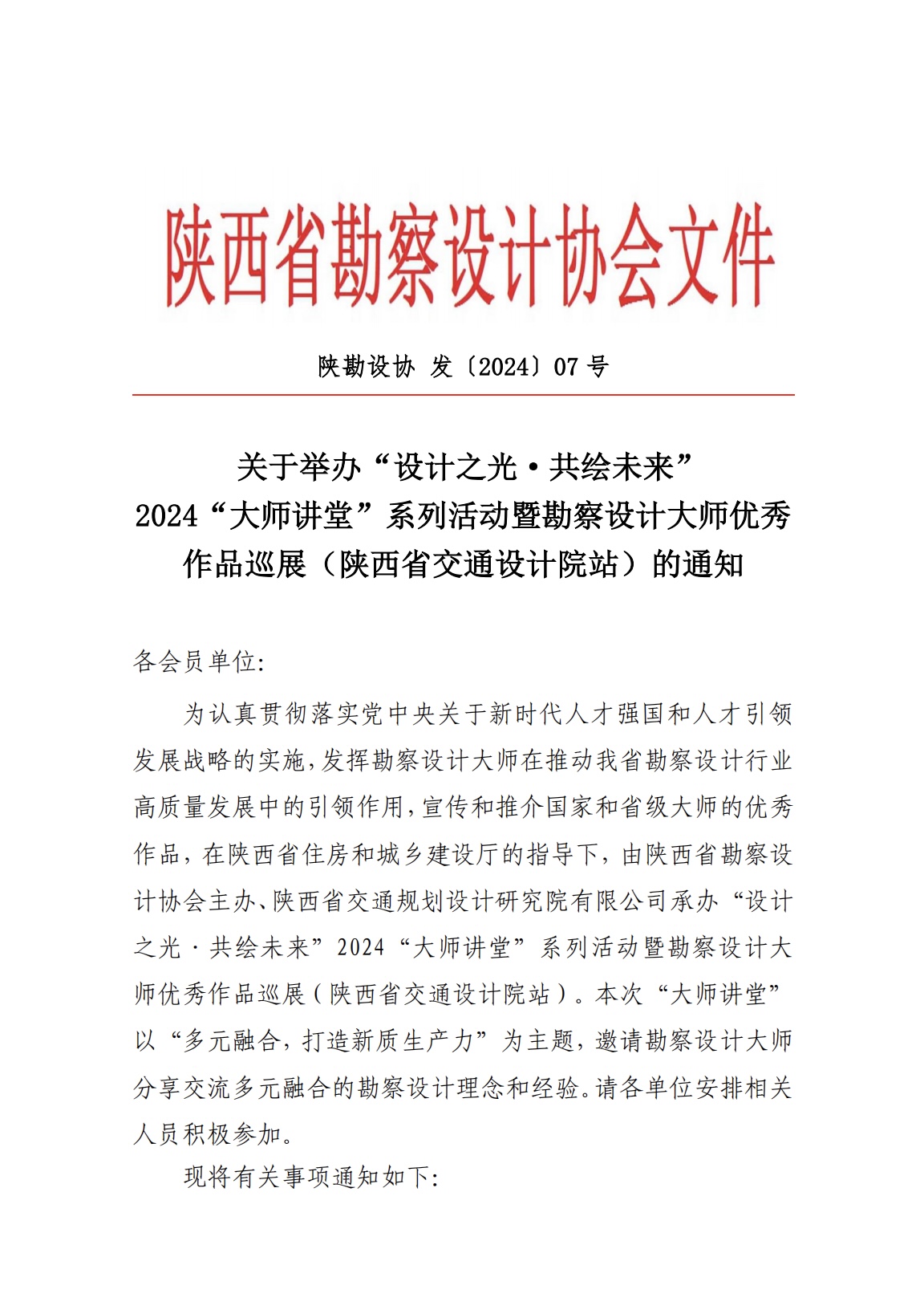 关于举办“设计之光·共绘未来”2024“大师讲堂”系列活动暨勘察设计大师优秀作品巡展(陕西省交通设计院站)的通知