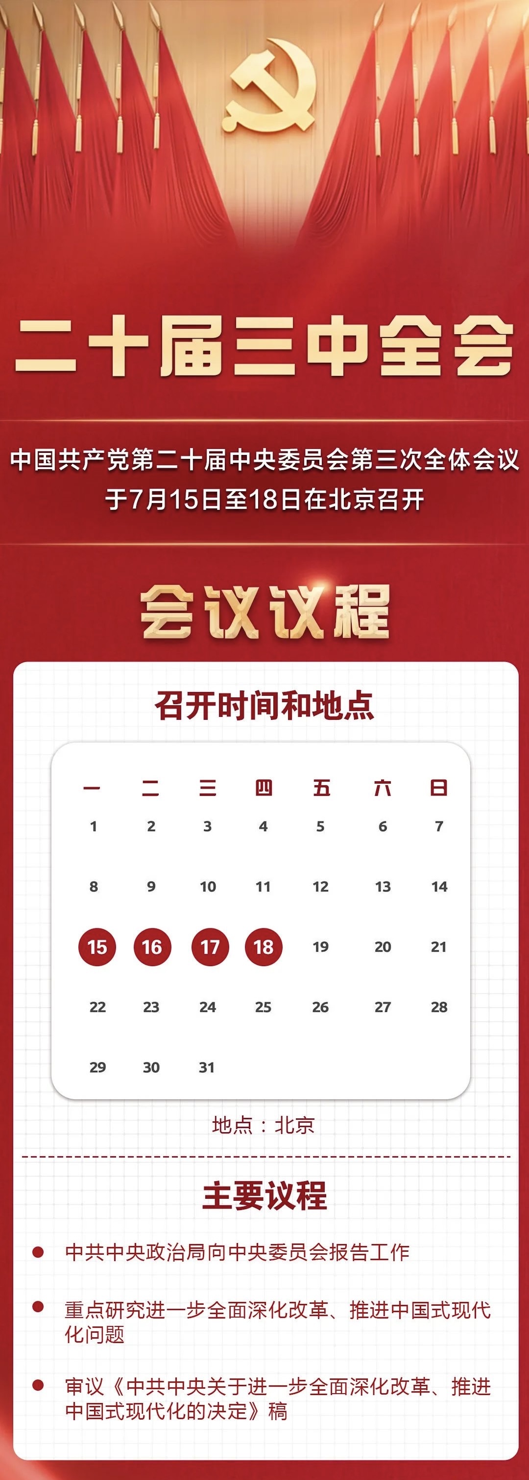 中国共产党第二十届中央委员会第三次全体会议于7月15日上午在北京开始举行。中央委员会总书记习近平代表中央政治局向全会作工作报告,并就《中共中央关于进一步全面深化改革、推进中国式现代化的决定(讨论稿)》向全会作了说明。