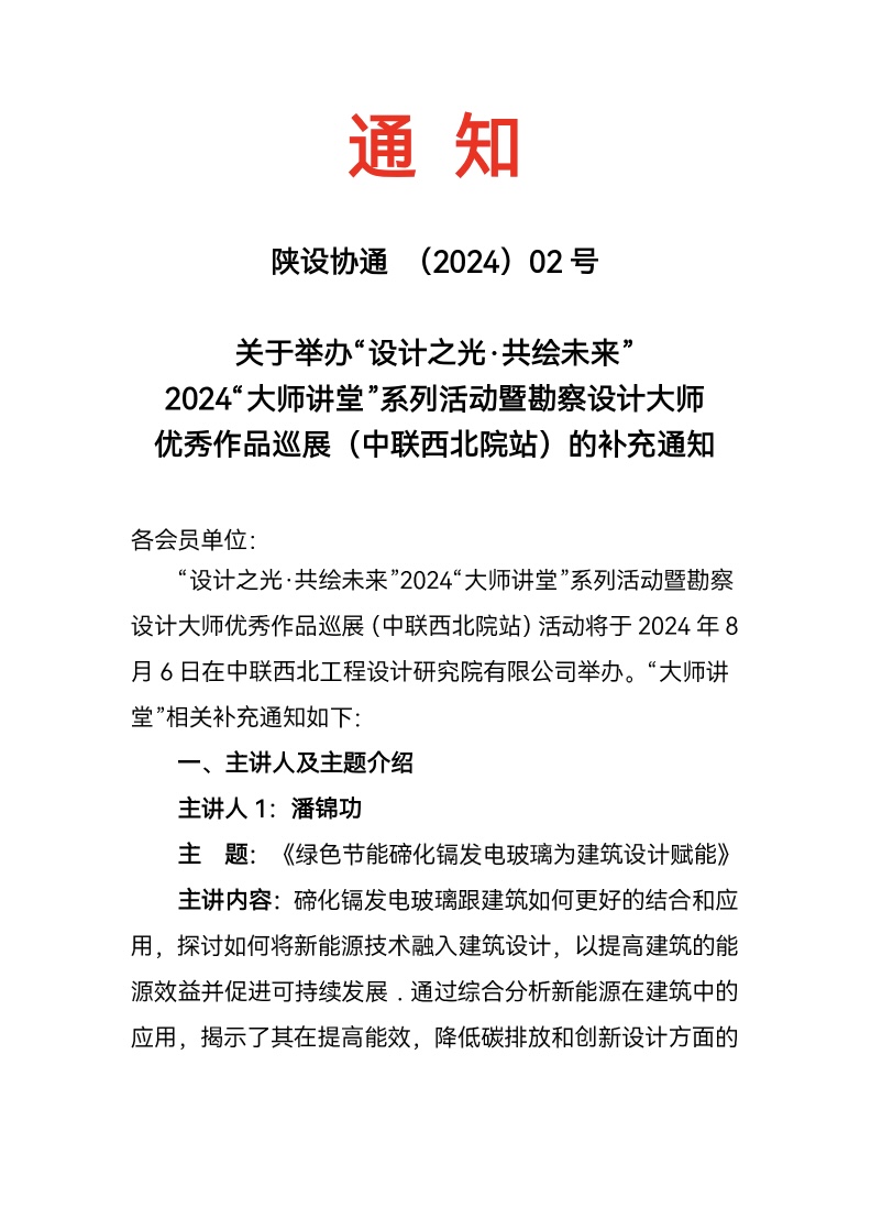 关于举办“设计之光·共绘未来”2024“大师讲堂”系列活动暨勘察设计大师优秀作品巡展(中联西北院站)的补充通知