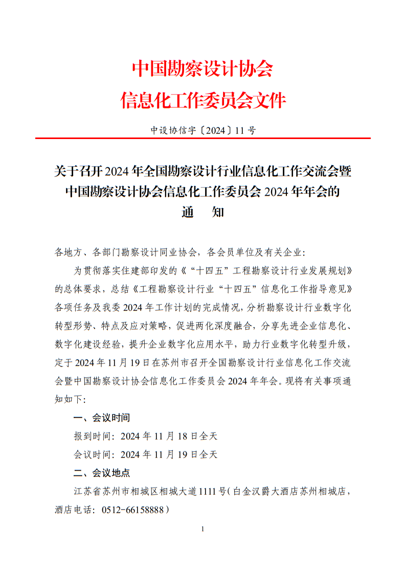 中设协信字〔2024〕11号关于召开2024年全国勘察设计行业信息化工作交流会暨中国勘察设计协会信息化工作委员会2024年年会的通知