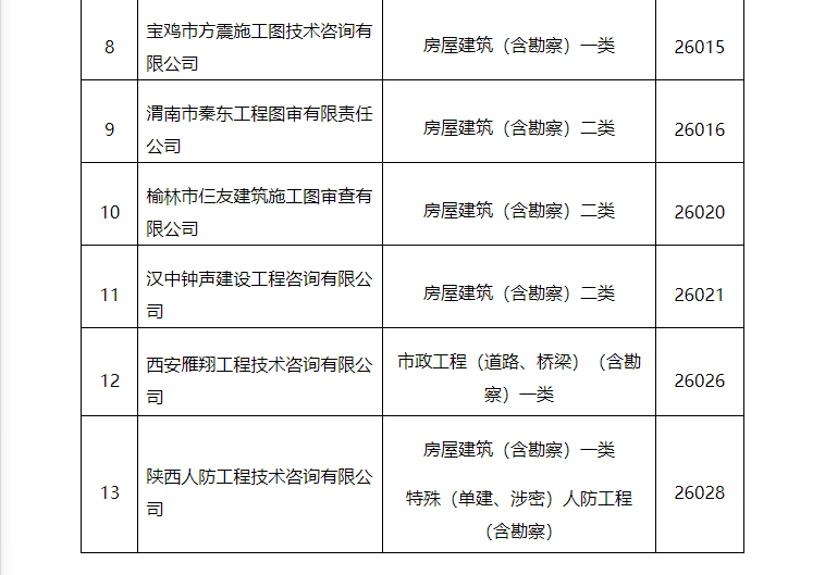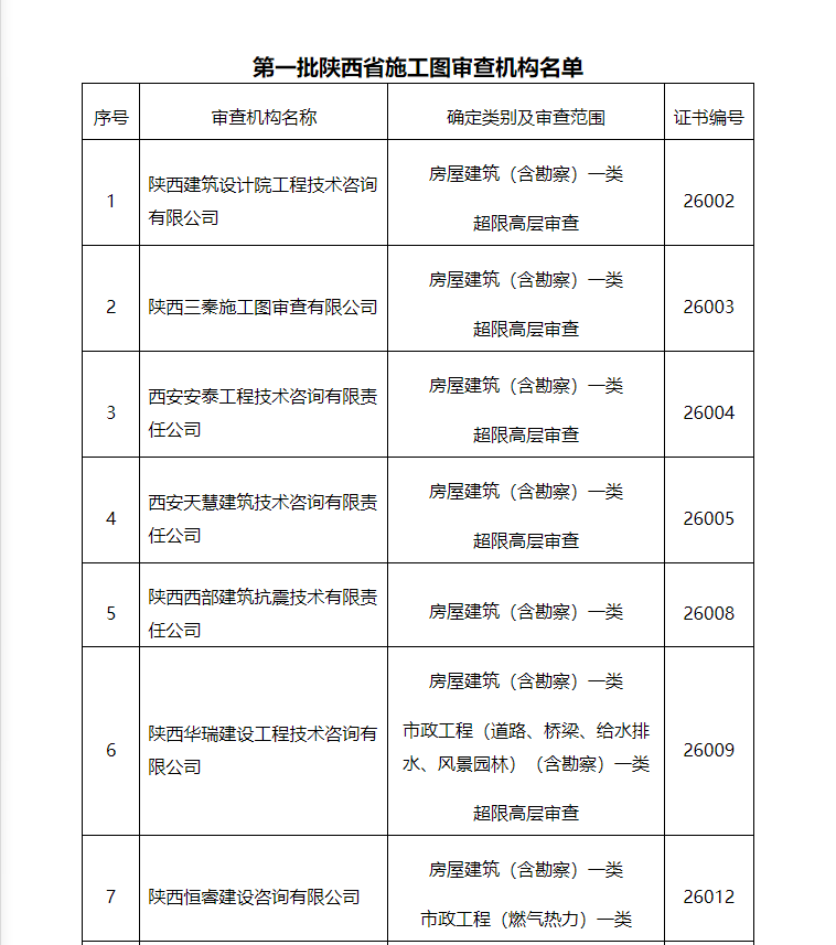 根据《房屋建筑和市政基础设施工程施工图设计文件审查管理办法》(住建部令第46号)等有关规定,省厅联合省国防动员办公室印发《关于开展全省施工图审查机构资格证书换证工作的通知》(陕建发〔2024〕145号),开展全省施工图审查机构资格证书换证工作。在市级住房城乡建设主管部门初审基础上,省厅对审查机构报送的换证材料予以核查。现将第一批符合规定条件的审查机构名单予以公布,对其换发5年有效期《陕西省施工图审查机构确定书》。其他机构可对照资格条件,补充完善材料,于12月20日前重新组织换证材料直接报送省厅。