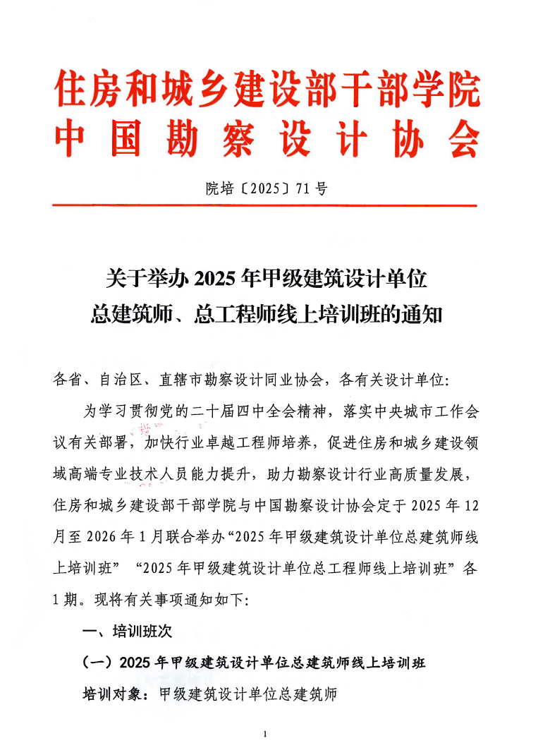 关于举办2025年甲级建筑设计单位总建筑师、总工程师线上培训班的通知 院培〔2025〕71号