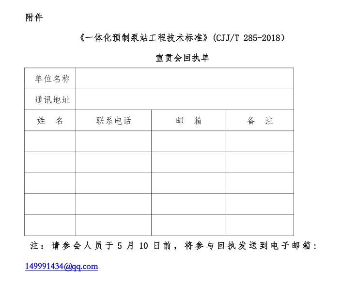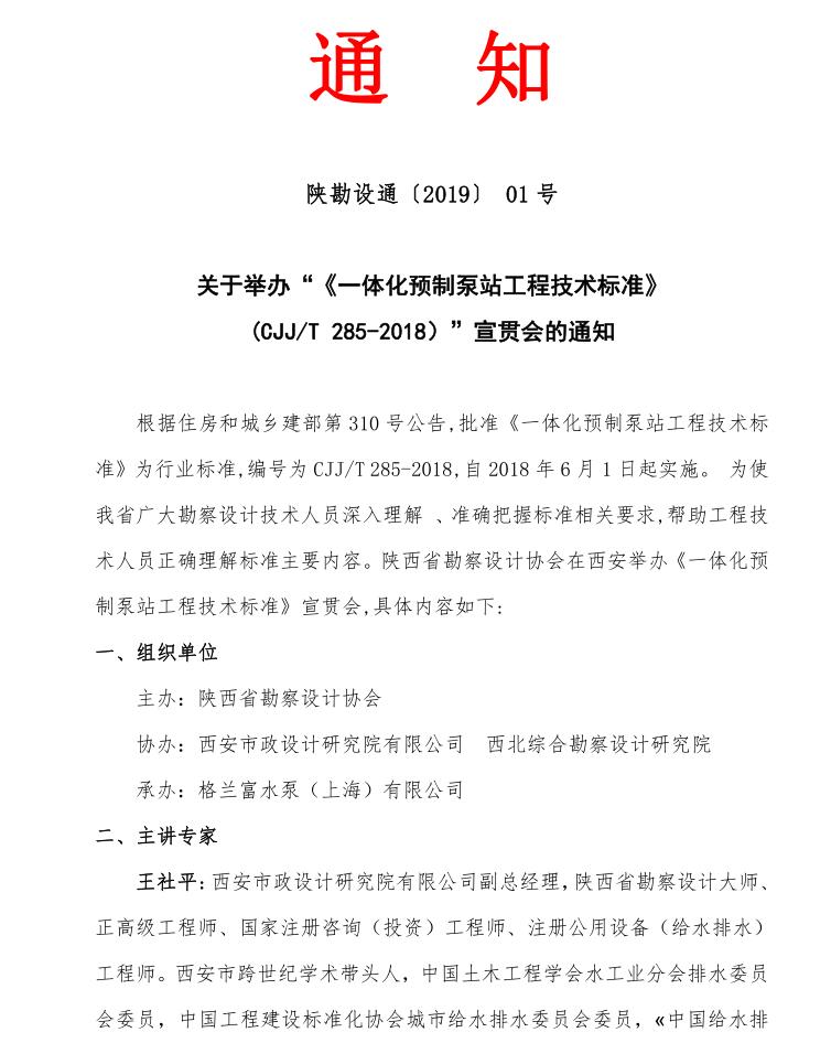 关于举办 “ 《一体化预制泵站工程技术标准》(CJJ/T 285-2018 ) ” 宣 贯会 的通知