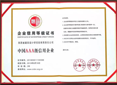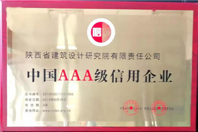 陕西省建筑设计研究院有限责任公司在企业信用等级综合审定中,以优秀综合实力和良好的社会口碑被授予“中国AAA级信用企业”光荣称号,并颁发了荣誉证书和牌匾。