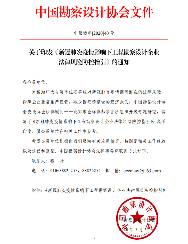 关于印发《新冠肺炎疫情影响下工程勘察设计企业 中设协字[2020]40号