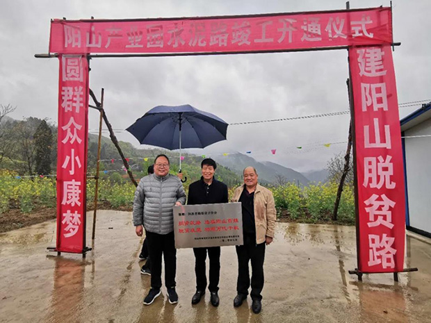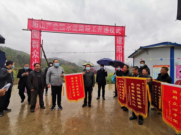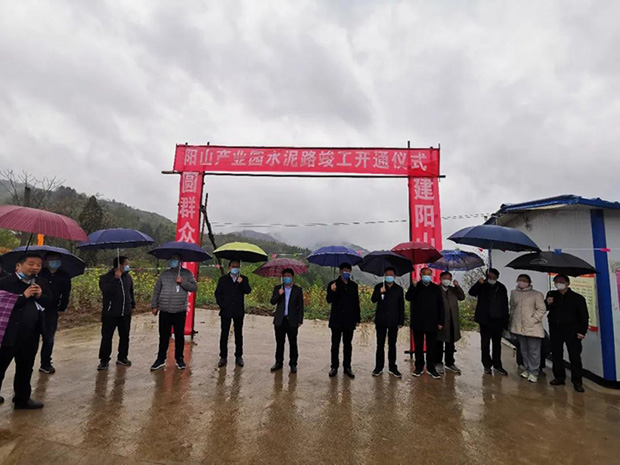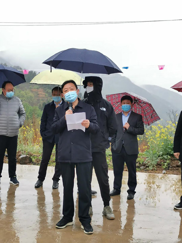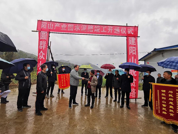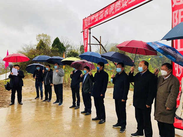 仪式开始,主持人介绍了参加活动的各位领导和嘉宾以及阳山产业园水泥路项目的建设情况。石坝社区“第一书记”燕建龙在致辞中对陕西兴汉路桥有限公司在全国人民抗疫期间很短的时间内修好3.2公里的阳山路表示诚挚的感谢!为他们所付出的艰苦努力表示敬意!同时对省住建厅、省建设系统脱贫攻坚略阳县合力团的领导不辞辛劳、不顾风雨来到现场,并在各方面所给予的支持表示衷心的感谢!他说,有了省住建厅和“合力团”以及各方面的支持才有我们今天的仪式。这条路的修建是我们扶贫工作中的一件大事,是我们扶贫工作中具有突破性的一个亮点!如果没有这条路,我们流转258亩阳山山地开展的乌鸡养殖、大棚蔬菜、经济林果、中草药种植等产业就运不出去,我们的消费扶贫也走不出去,如今有了这条平坦、整洁的水泥路,我们的扶贫工作效果会更好,力度会更大,群众的生活也会更加美好!阳山海拔1000米,所有土地山泉水灌溉,生态环境非常优美,有了这条路,我们的阳山产业园区也完全可以实现作为“略阳近郊生态旅游目的地-健康生活基地-省市县扶贫教育基地-田园综合体示范点-西综勘党建教育基地”的初衷和愿景。最后,他对略阳县委县政府各级领导和部门、横现河街道办及石坝社区两委以及老百姓对修建这条路的全力支持与配合表示最衷心的感谢!