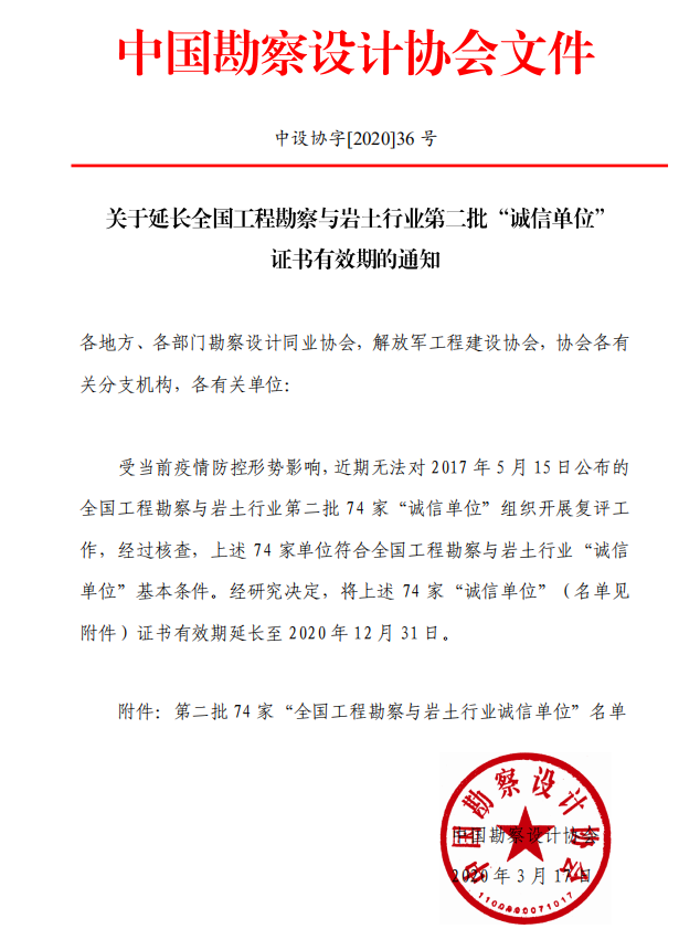 关于延长全国工程勘察与岩土行业第二批“诚信单位”证书有效期的通知 中设协字[2020]36号