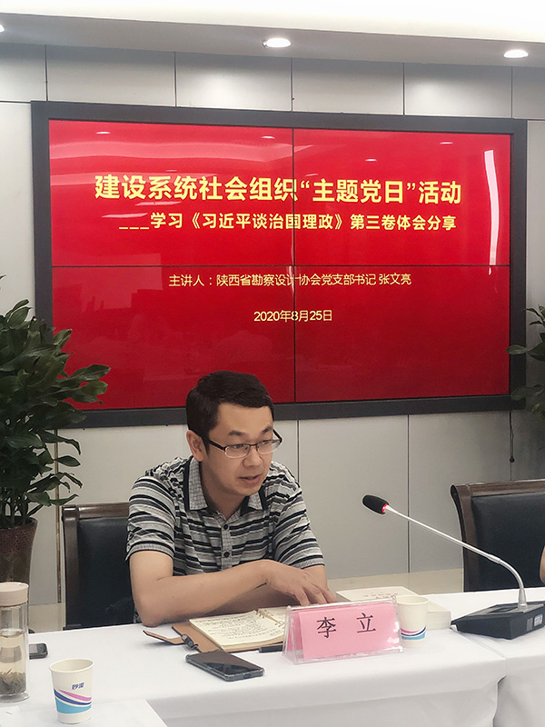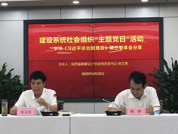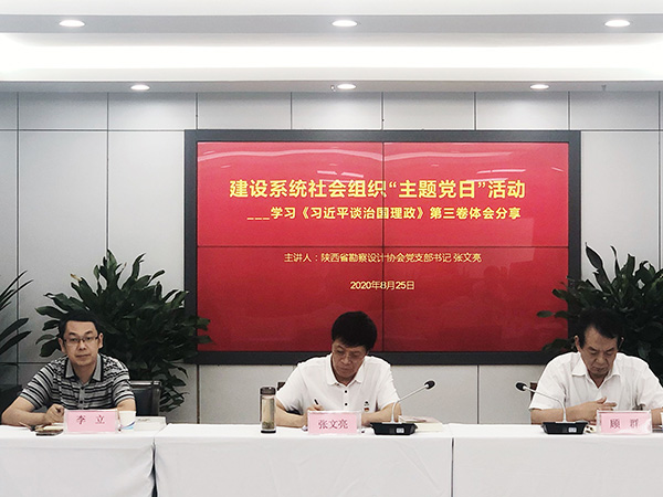 8月25日陕西省勘察设计协会与陕西省建设工程造价管理协会、陕西省建设监理与陕西省建设法制协会、陕西省房地产业协会、陕西省建筑装饰协会、陕西省建设教育协会、陕西省劳保统筹基金协会、陕西省建机门窗协会、省物业管理协会、陕西省建筑行业劳动保险协会、陕西省建筑节能协会、陕西省商品混泥土行业协会、陕西省抗震防灾协会等十二家建设系统协会党支部,在西安海航酒店联合开展了学习《习近平谈治国理政》第三卷,全面系统深刻理解习近平新时代中国特色社会主义思想的精神实质“主题党日”活动。参会党员和入党积极分子30人。这次“主题党日”活动由陕西省勘察设计协会党支部负责组织筹办。