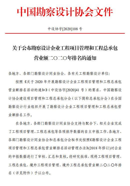 关于公布勘察设计企业工程项目管理和工程总承包营业额2020年排名的通知