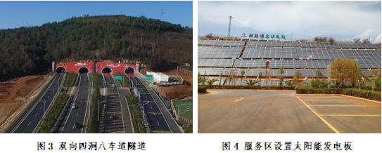 项目区土地资源尤其珍贵,路线设计沿盆地边缘行走,尽可能的减少了对坝子地的占用,同时还通过设置桥梁、减小附加用地宽度、调整边坡坡率等方式,进行了精细化设计。项目区地质条件复杂。勘察工作利用航测成图、地质遥感和工程地质调绘成果进行工程地质选线,采用电探、震探、钻探、测试等多种手段,提高了勘察效率,查明了工程地质条件,未出现重大地质变更。项目对部分桥梁设计采用钢箱梁,部分涵洞、通道采用钢波纹管,既提高施工速度,亦切实贯彻绿色公路建设理念;本项目兔耳关互通钢箱梁桥获评“第十三届第一批中国钢结构金奖工程”;同时“一种钢波纹管涵洞轴向加强结构”已获批国家专利。针对嵩明隧道埋深浅、围岩差、断面大、施工安全风险大的特点,项目创造性地提出了双向四洞八车道的隧道断面型式,既缩短了施工工期,又降低了施工安全风险。本项目在嵩明服务区设置充电站(云南省首例),利用挖方边坡设置太阳能发电板,充分体现了绿色公路、低碳环保的新理念。