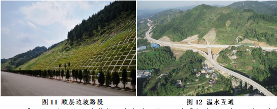 本项目按照交通部公路勘察设计典型示范工程的要求进行设计。通过灵活采用平纵指标,设置高低路基降低挖方顺层边坡的高度和长度,控制桥梁规模;在高填路基旁设置弃土场,通过两者的结合,减小桥梁规模,并解决弃渣困难问题;根据顺层边坡的倾向,灵活选用顺层面清方或强支护方式保证顺层边坡安全;通过施工风险源分析,设计时采取综合措施保护沿线民房、公路、铁路安全;针对项目穿越高瓦斯煤层,专门对瓦斯隧道进行了专项设计,并制定揭煤防突流程,保证隧道施工运营安全。