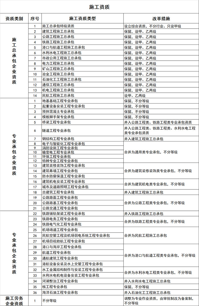 保留地基基础工程、起重设备安装工程、核工程等专业承包资质;将原专业承包资质整合为建筑装修装饰类、建筑机电类、公路工程类、港口与航道工程类、铁路工程类、水利水电工程类、通用类专业承包资质;专业承包资质不分等级。