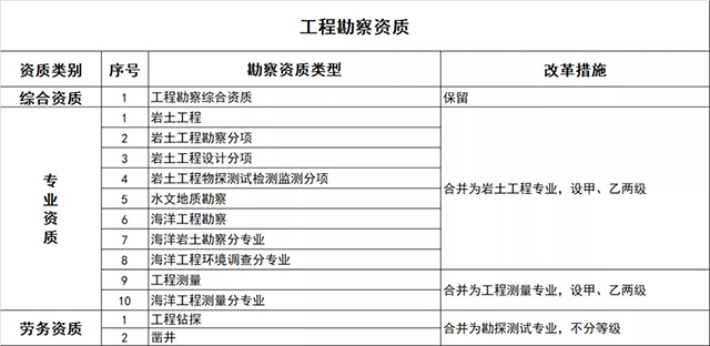 保留综合资质。将4类专业资质及勘察劳务资质整合为岩土工程、工程测量、勘探测试等3类专业资质。