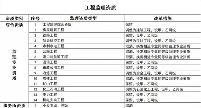 (四)工程监理资质。保留综合资质。取消水利水电工程、公路工程、港口与航道工程等专业资质,其资质要求执行有关行业主管部门规定。取消农林工程监理资质,建设单位委托农林工程监理业务时,不再作资质要求。上述4个监理专业资质取消后,相关企业可以换发相近专业同等级监理专业资质。监理专业资质等级压减为甲、乙两级,原丙级资质并入相应专业的乙级资质。取消事务所资质。