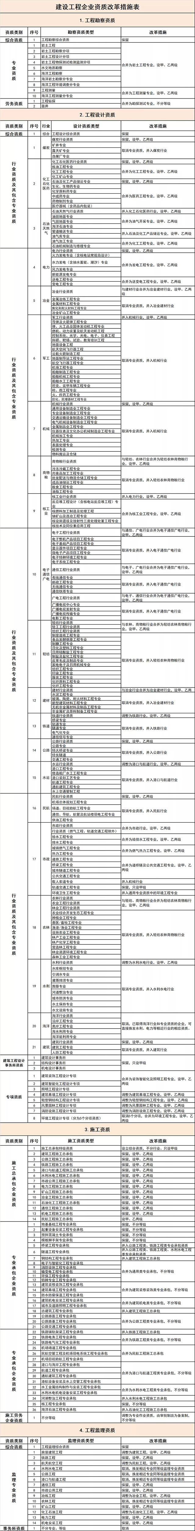 按照国务院深化“放管服”改革部署要求,大幅压减企业资质类别和等级(改革措施详见附件3)。改革后,工程勘察资质分为综合资质和专业资质,工程设计资质分为综合资质、行业资质、专业资质和事务所资质,施工资质分为综合资质、总承包资质、专业承包资质和专业作业资质,工程监理资质分为综合资质和专业资质。