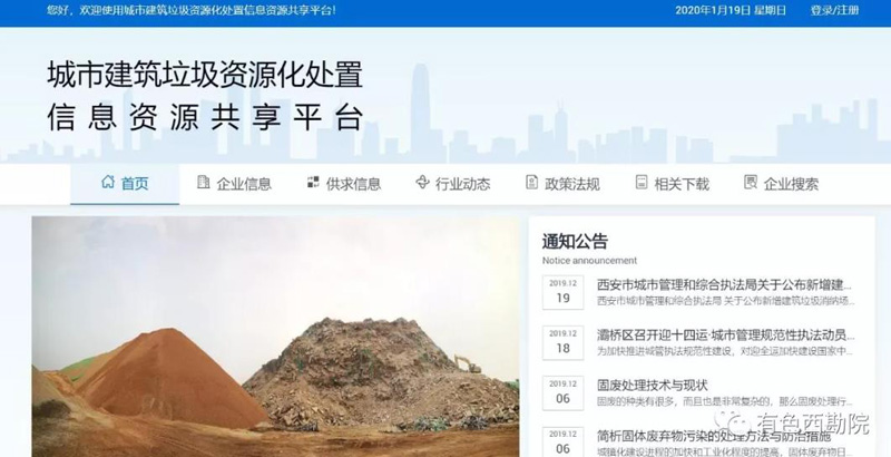 2020年初,由中国有色金属工业西安勘察设计研究院有限公司城市建筑垃圾资源化处置研究院,经过半年的努力,联合国内有关高校、科研机构和从业单位共同开发的“城市建筑垃圾资源化处置信息资源共享平台”近日已全面向社会和公众免费开放,用户只需注册登录,我市建筑垃圾信息一目了然!(登入方法:输入网址:http://www.sngreentown.com)
