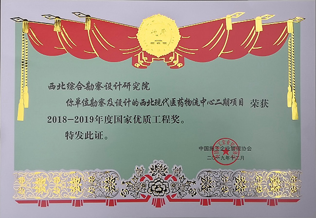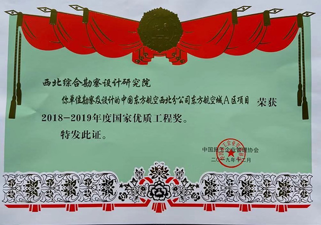 近日,在国家会议中心召开的“国家优质工程奖总结表彰大会”上,由西北综合勘察设计研究院实施勘察的中国东方航空西北分公司东方航空城A区项目、西北现代医药物流中心二期项目荣获“国家优质工程奖”。