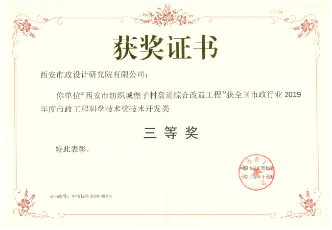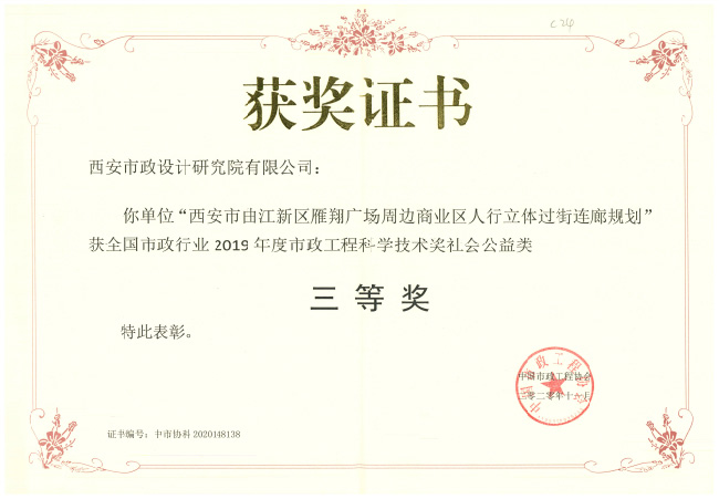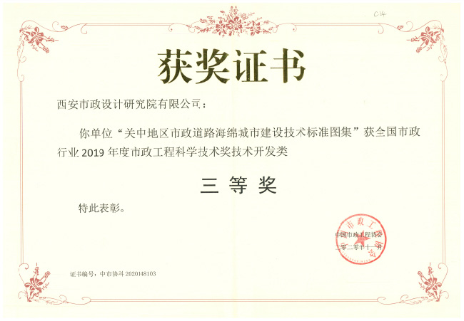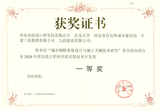 2020年12月,全国市政行业2019年度市政工程科学技术奖表彰大会在广西南宁顺利召开,我公司共计4项科研项目获奖,其中“城市钢桥景观设计与施工关键技术研究”喜获技术开发类一等奖,“西安市纺织城堡子村盘道综合改造工程”、“关中地区市政道路海绵城市建设技术标准图集”获技术开发类三等奖,“西安市曲江新区雁翔广场周边商业区人行立体过街连廊规划”获社会公益类三等奖。
