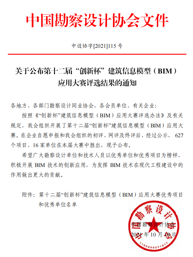 关于公布第十二届“创新杯”建筑信息模型( BIM ) 应用大赛评选结果的通知